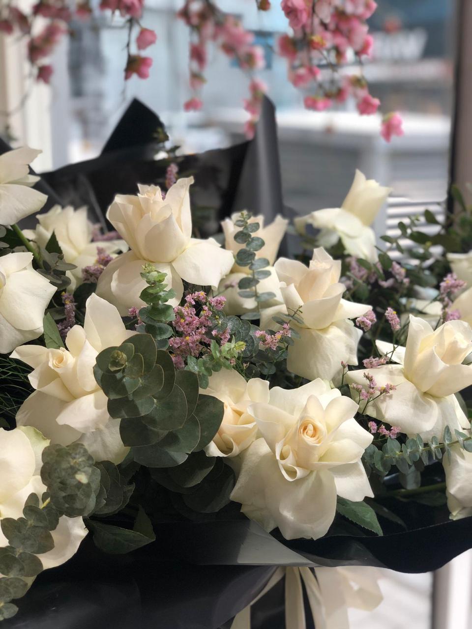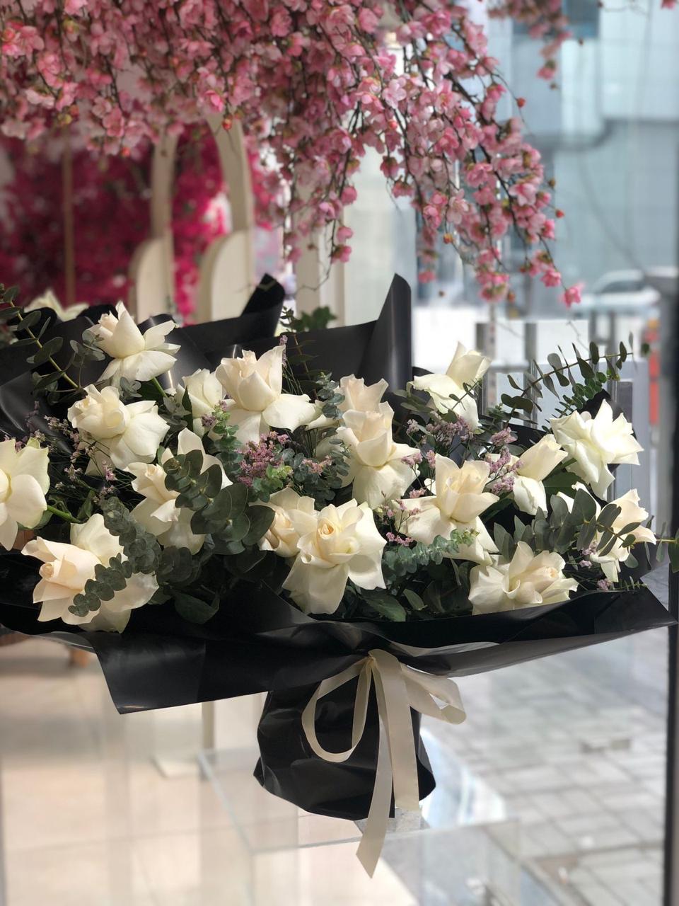 Experience the timeless elegance of white roses in our stylish black wrapping, exclusively at Florabella Flowers. Perfect for any occasion, these stunning roses symbolize purity and grace, making them an ideal gift or centerpiece. Our expert florists ensure each bouquet is arranged with the utmost care, offering you fresh and fragrant flowers. Enjoy fast, reliable delivery across Abu Dhabi and make someone's day special with this beautiful arrangement.