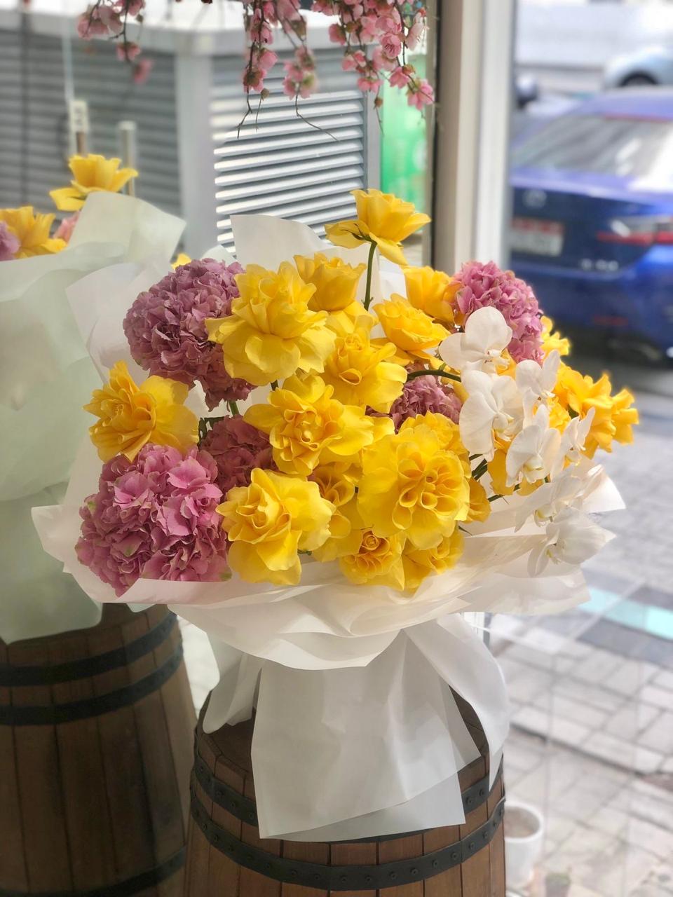 Illuminate any event with the breathtaking beauty of our "Blossoming Radiance" bouquet. This vibrant arrangement features a captivating mix of sunny yellow roses, delicate pink hydrangeas, and an exotic orchid, skillfully combined to create a memorable and elegant gift. Handcrafted by our experienced florists, this bouquet is ideal for any celebration, from birthdays to anniversaries or simply to show you care.