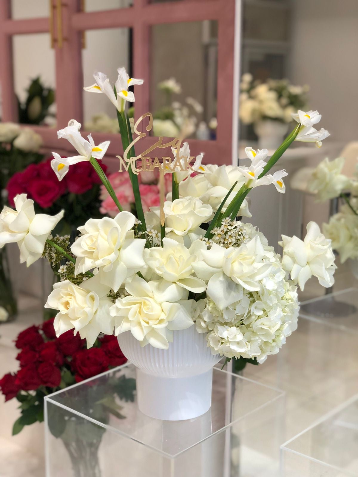 Celebrate the purity and joy of Eid with our Eid Elegance in White arrangement. This exquisite display features a selection of mixed white flowers, artfully arranged in a stylish pot, crowned with an elegant Eid topper. Symbolizing peace and renewal, these blooms are perfect for adding a touch of serene beauty to your home or as a distinguished gift during the Eid festivities.