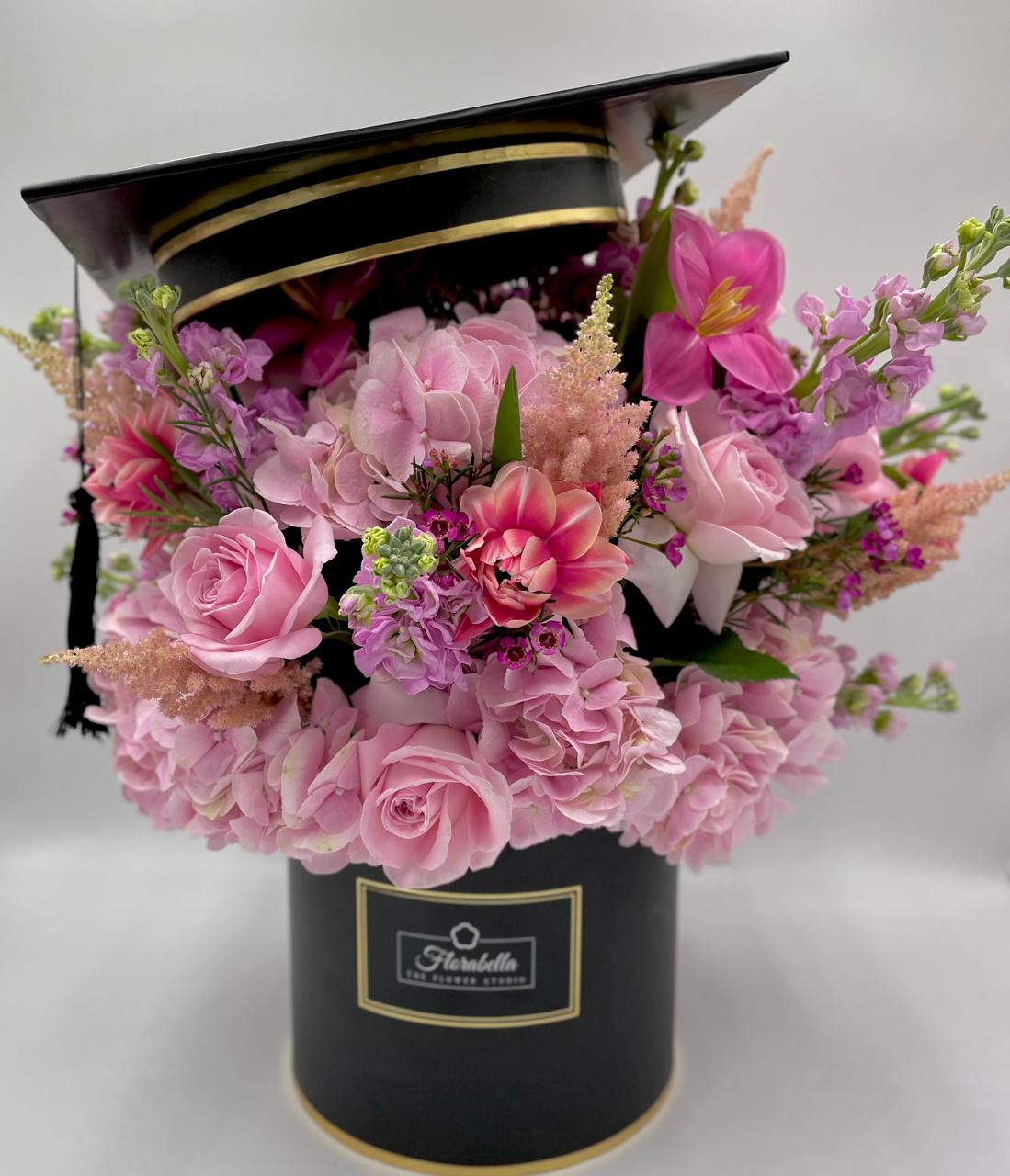 Celebrate the achievements of your loved ones with our elegant box of light pink flowers, adorned with a graduation cap, exclusively from Florabella Flowers. These delicate flowers symbolize admiration and joy, making them the perfect gift for a graduate. Each arrangement is crafted with care by our skilled florists, ensuring freshness and beauty. With our reliable delivery service in Abu Dhabi, congratulate the new graduate with a thoughtful and stylish gift that will be cherished.