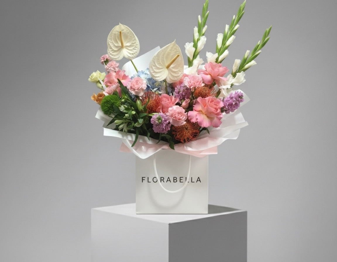 A romantic garden blend of peonies, spray roses, ranunculus and hydrangea in soft pastels, styled in our Florabella paper bag.