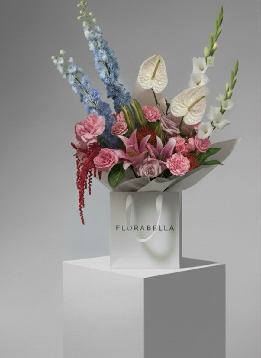 A romantic garden blend of peonies, spray roses, ranunculus and hydrangea in soft pastels, styled in our Florabella paper bag.